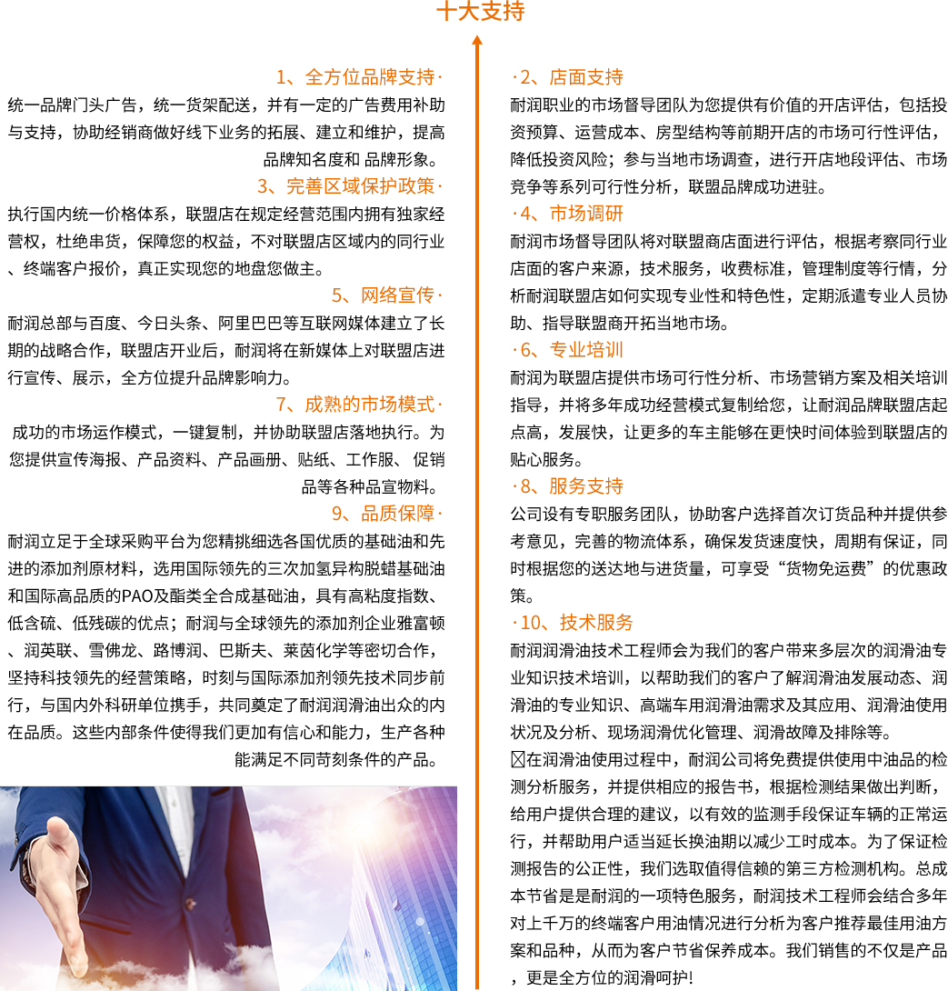 如果您正在從事潤滑油或汽車后市場等相關業務并了解行業發展趨勢;如果您向往與高端潤滑油品牌卻苦無品牌渠道;如果您資金、場地、人員、車輛、渠道等都準備充足;如果您心懷高遠,想將自己的人生推向新的高度,那么趕快行動吧,加入-耐潤潤滑油,開啟一場分享成功的潤滑之旅!