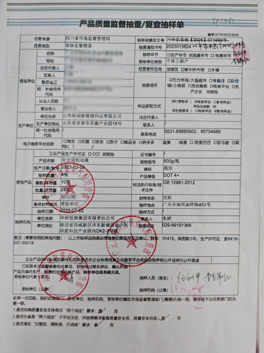 近日,耐潤潤滑油旗下全合成制動液在四川省市場監督管理局組織的省級產品質量監督抽查中,經華研檢測集團有限責任公司專業檢測,各項指標全部合格,順利通過權威檢驗!