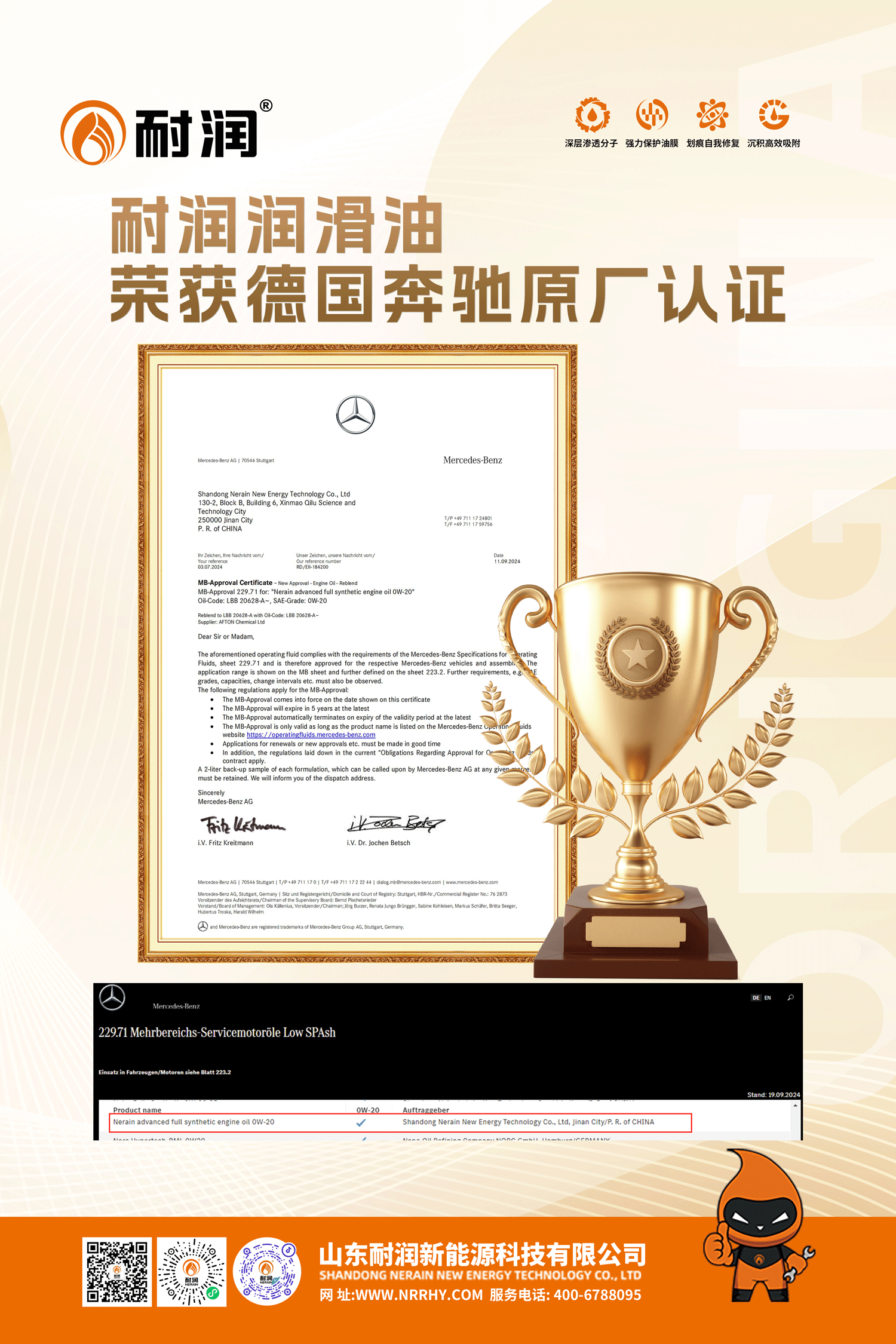 近日,耐潤潤滑油產品榮獲德國梅賽德斯·奔馳MB-229.71標準認證,這標志著耐潤產品受到了世界權威汽車制造商的認可,不僅進一步證明了耐潤潤滑油產品在質量和性能方面的卓越表現,也體現了其在潤滑油市場上的競爭實力。