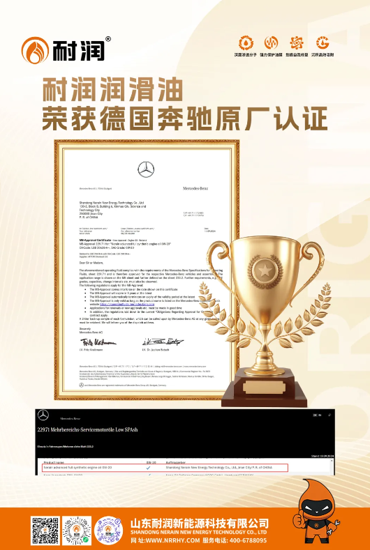 近日,耐潤產品通過德國梅賽德斯·奔馳MB-229.71標準認證,0W-20產品不僅滿足奔馳發動機用油的高標準,高要求,也符合國六排放標準,更加適應全球范圍內日益嚴苛的新型環保要求。