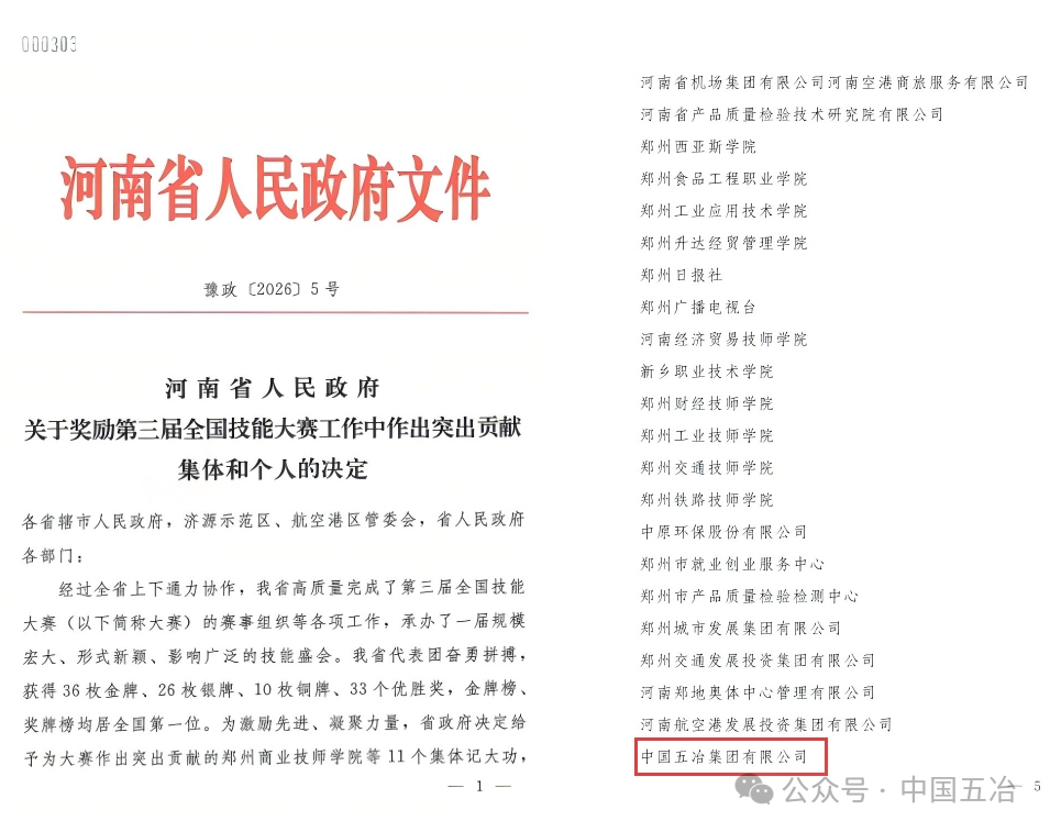 近日,河南省人民政府发布《关于奖励第三届全国技能大赛工作中作出突出贡献集体和个人的决定》,对在“国赛”筹备和组织工作中作出突出贡献的集体和个人予以表彰,中国五冶榜上有名,荣获集体记功奖励。